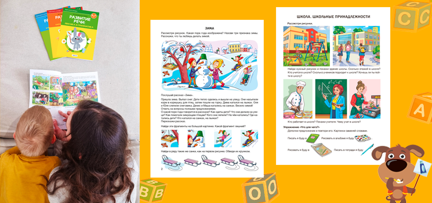 Основа серии — 2 больших наглядных пособия «Развитие речи: лексика и грамматика». Логопеды называют их «учебниками». Эти издания охватывают все 32 темы из учебной программы: материала для работы хватит на весь учебный год.