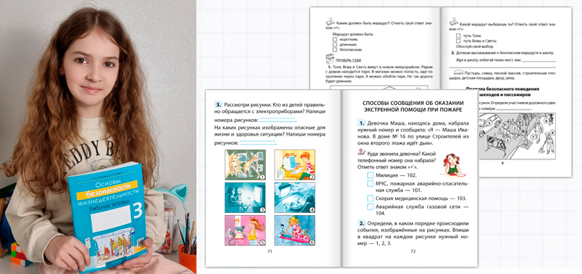 Для примера можно взять первое задание первой темы по ОБЖ в 4 классе. Чтобы его выполнить, понадобится меньше минуты — достаточно записать цифру правильного рисунка. Но учитель может построить вокруг этого задания обстоятельную беседу. С помощью иллюстраций в рабочей тетради можно обсудить ключевые понятия урока: «безопасный маршрут», «пешеходный переход», «дорога», «микрорайон». Затем можно поговорить о правилах безопасности в городе, нарисовать на доске карту района рядом со школой, расспросить учащихся об их маршрутах и даже предложить нарисовать эти маршруты мелом. Учитель может использовать наглядность так, как считает нужным для логичного построения урока. Рабочие тетради станут для этого удобным подспорьем.