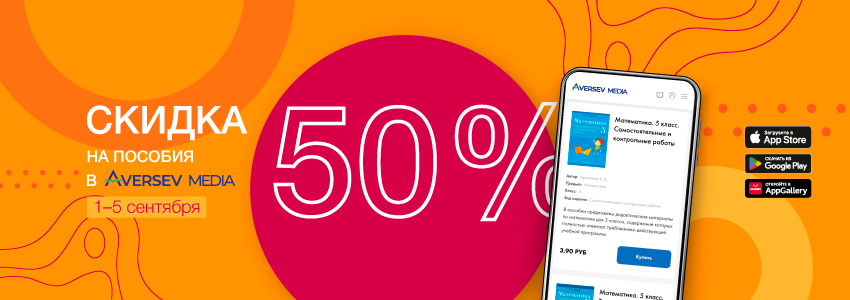 С 1 по 5 сентября 2023 года в приложении Aversev Media действует скидка 50 %* на все пособия издательства «Аверсэв».