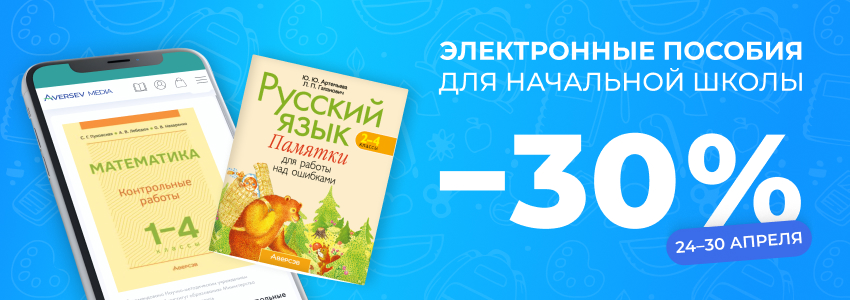 * Обращаем ваше внимание: при оплате книг в приложении e-Aversev через платформы Android и IOS скидка действует с ограничениями. Это связано с политикой Google и Apple относительно установления цен на товары. В акции не участвуют пособия других издательств и полные сборники тестов РИКЗ.В рамках акции с 24 по 30 апреля издательство «Аверсэв» предоставляет скидку 30 % на электронные учебные пособия для младших школьников и их учителей в приложении Aversev Media. Это отличная возможность приобрести качественные издания по выгодной цене. Работать с электронными книгами можно на планшете и смартфоне через приложение, а также на компьютере с помощью браузерной версии media.aversev.by.