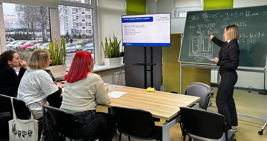 Одна из лекций была посвящена производственному отделу. На ней студенты узнали о технологиях расчета сырья для тиража, критериях выбора формата пособий, видах бумаги и требованиях ГОСТа. В середине учебного курса студенты получили уникальную возможность побывать на обзорной экскурсии в Белорусском Доме печати.
