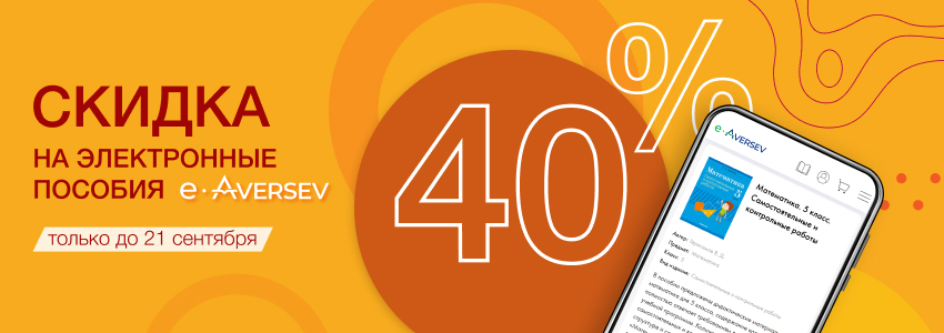 * Обращаем ваше внимание: при оплате книг в приложении e-Aversev через платформы Android и IOS скидка действует с ограничениями. Это связано с политикой Google и Apple относительно установления цен на товары. В акции не участвуют пособия других издательств и полные сборники тестов РИКЗ.Новый учебный год — новые возможности! С 15 до 21 сентября дарим скидку 40 % на электронные книги в приложении e‑Aversev.