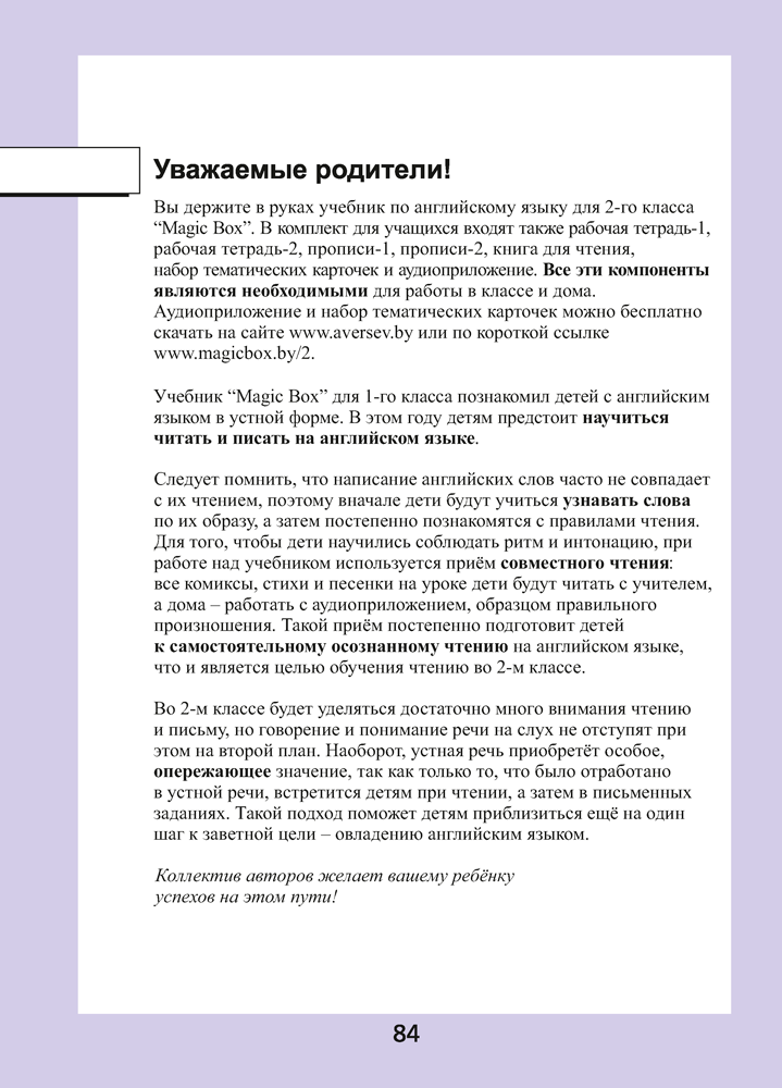 Книга для ученика является составной частью учебно-методического комплекса «Волшебная шкатулка» для 2 класса, в который также входят рабочая тетрадь-1, рабочая тетрадь-2, книга для чтения, прописи-1, прописи-2, книга для учителя, набор тематических карточек, аудиоприложение и интерактивный учебник.