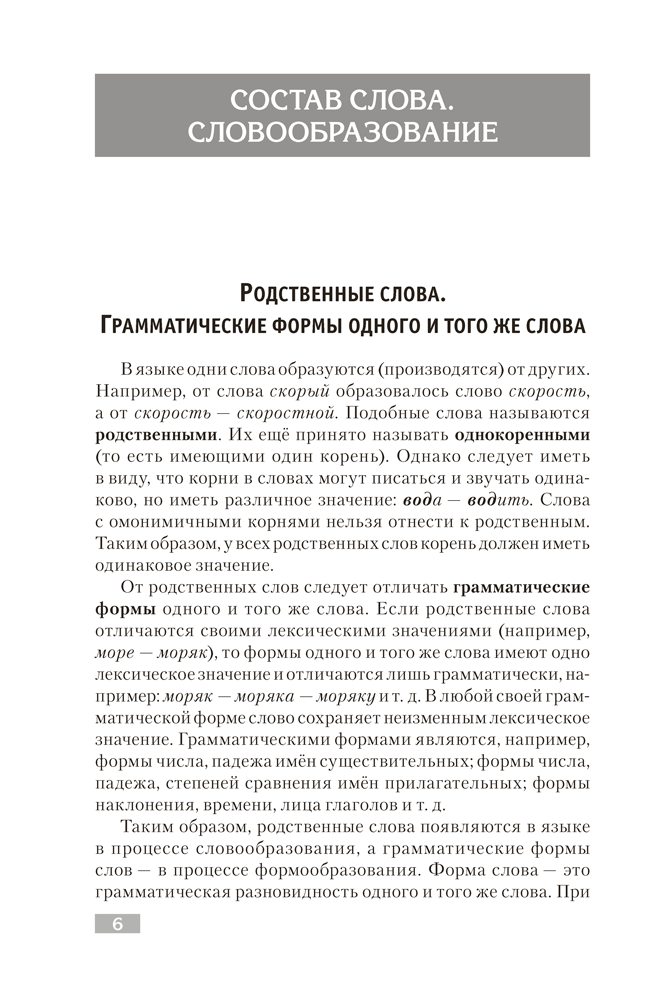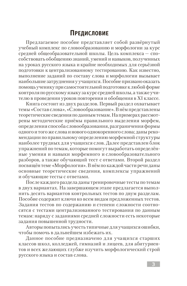 Издание включает теоретические сведения по разделам «Состав слова. Словообразование» и «Морфология» за курс средней общеобразовательной школы, упражнения и обучающие тесты по каждой теме, общие контрольные тесты, ключи ко всем видам тестов.