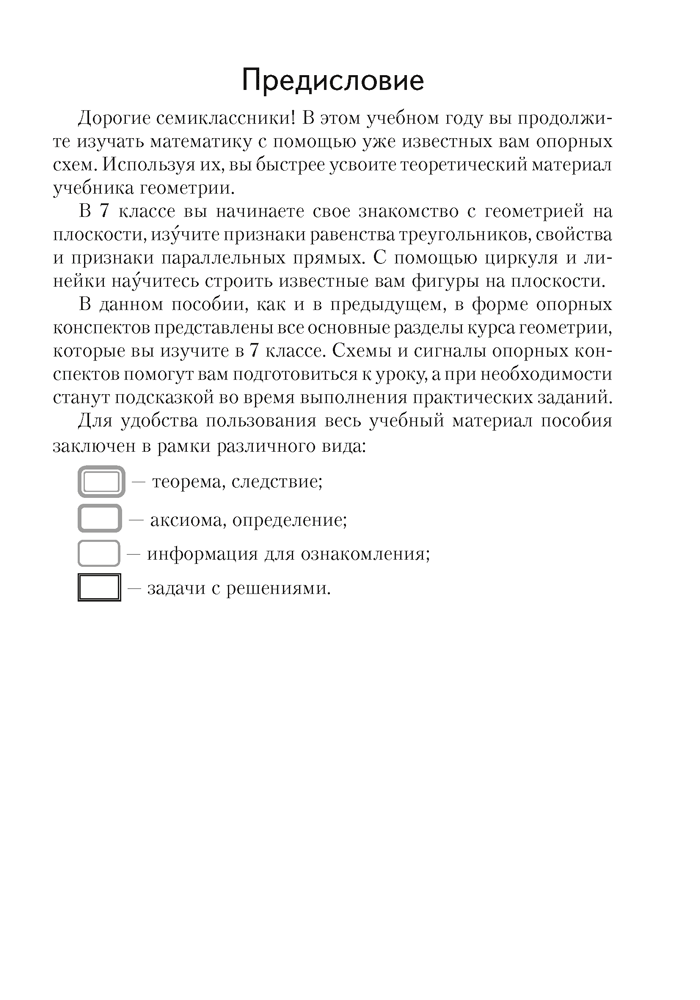 В пособии в форме опорных конспектов наглядно представлен учебный материал курса геометрии 7 класса. Использование опорных конспектов позволит учащимся сконцентрировать внимание на наиболее трудных для запоминания местах, многократно повторить изученное, а учителям — провести оперативный контроль усвоения материала, привлечь к проверке знаний родителей.