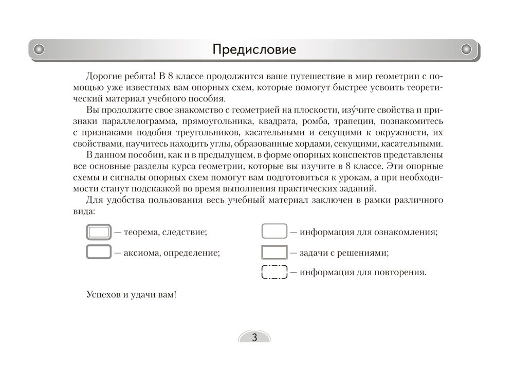 В пособии в форме опорных конспектов наглядно представлен учебный материал курса геометрии 8 класса. Использование опорных конспектов позволит учащимся сконцентрировать внимание на наиболее трудных для запоминания местах, многократно повторить изученное, а учителям — провести оперативный контроль усвоения материала, привлечь к проверке знаний родителей.