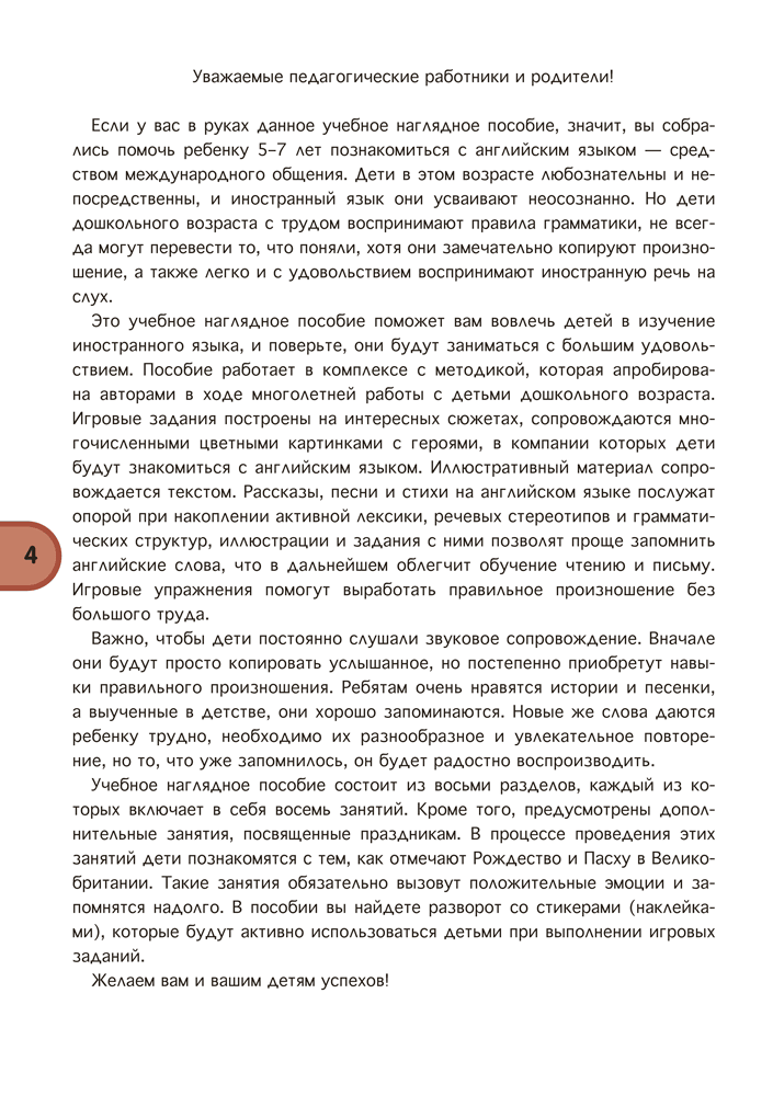 Издание содержит иллюстративный материал в виде сюжетных игровых заданий, тексты стихов и песен для воспитанников старшей группы (от 5 до 7 лет), способствующий реализации задач образовательной области «Развитие речи и культура речевого общения (иностранный язык)» учебной программы дошкольного образования.