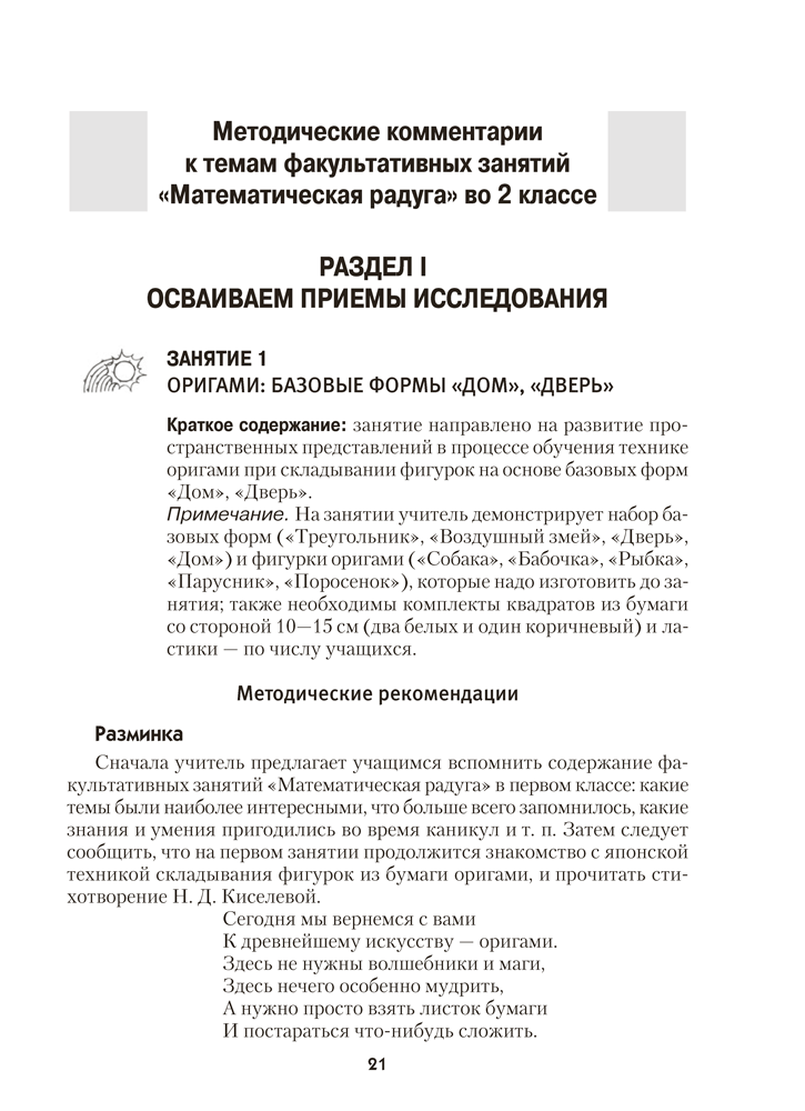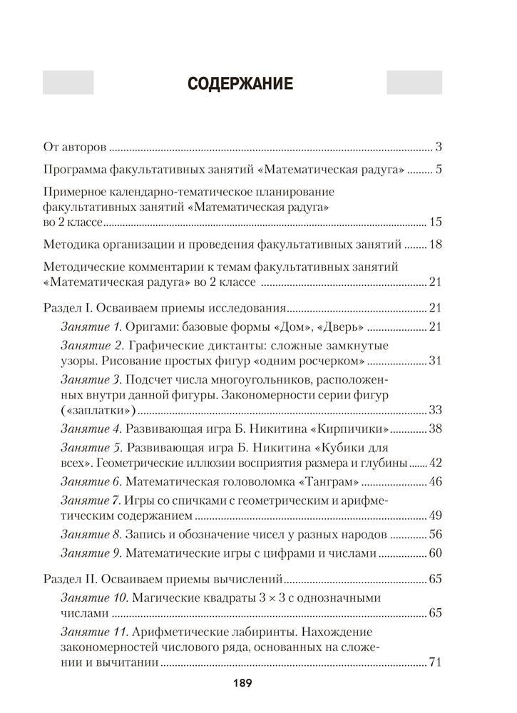 Пособие для учителей включает методические рекомендации по организации и проведению факультативных занятий «Математическая радуга» во 2 классе, характеристику особенностей изложения учебного материала, методические комментарии ко всем темам курса, а также описание системы упражнений рабочей тетради.