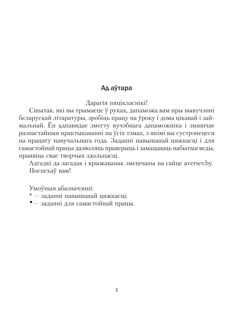 Сшытак падрыхтаваны ў адпаведнасці з праграмай па беларускай літаратуры і дапаўняе вучэбны дапаможнік для 5 класа. Заданні і практыкаванні розных узроўняў складанасці маюць творчы характар, развіваюць здольнасці вучняў. Сшытак дапаможа замацаваць і праверыць набытыя на ўроку веды.