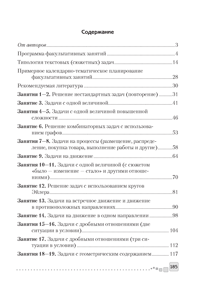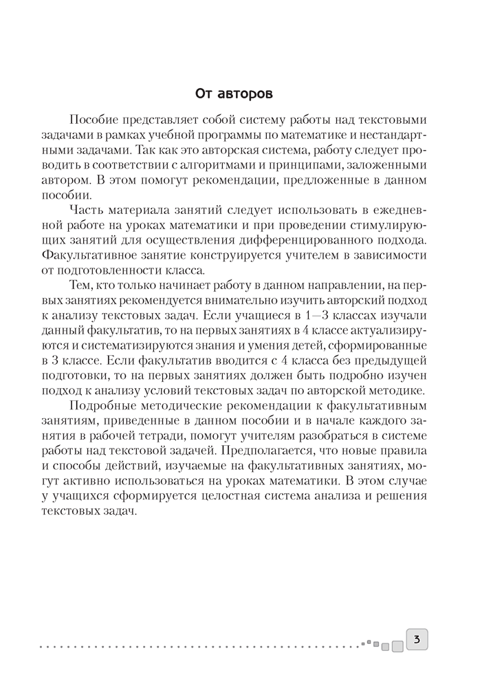 Пособие содержит методические рекомендации по проведению факультативных занятий в 4 классе. Данный материал поможет учителям разобраться в авторской системе работы с текстовыми и нестандартными задачами. Представленные в пособии алгоритмы и принципы сформируют у учащихся целостную систему анализа и решения текстовых задач.