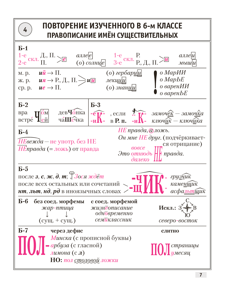 Издание составлено в соответствии с материалом учебного пособия по русскому языку для 7 класса. Основные правила представлены в виде схем и опорных конспектов.