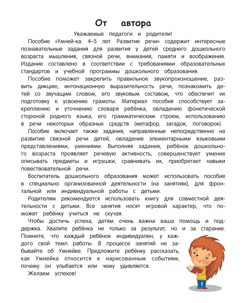 Пособие направлено на закрепление у детей от 4 до 5 лет правильного звукопроизношения, развитие дикции и интонационной выразительности речи, знакомство со звучащим словом. Материал книги способствует закреплению и уточнению словаря ребёнка, формированию грамматического строя речи, развитию связной речи. Содержание пособия соответствует задачам образовательной области «Развитие речи и культура речевого общения» учебной программы дошкольного образования.