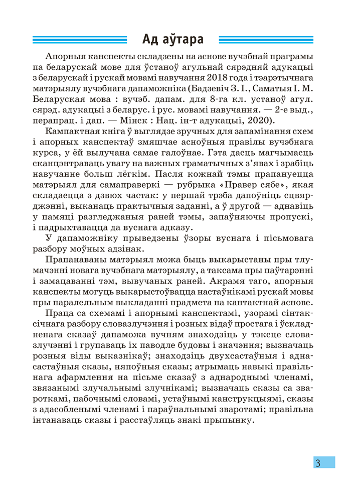Апорныя канспекты складзены на аснове вучэбнай праграмы па беларускай мове для ўстаноў агульнай сярэдняй адукацыі з беларускай і рускай мовамі навучання 2018 года і тэарэтычнага матэрыялу вучэбнага дапаможніка (Бадзевіч З. І., Саматыя І. М. Беларуская мова : вучэб. дапам. для 8-га кл. устаноў агул. сярэд. адукацыі з беларус. і рус. мовамі навучання. — 2-е выд., перапрац. і дап. — Мінск : Нац. ін-т адукацыі, 2020).