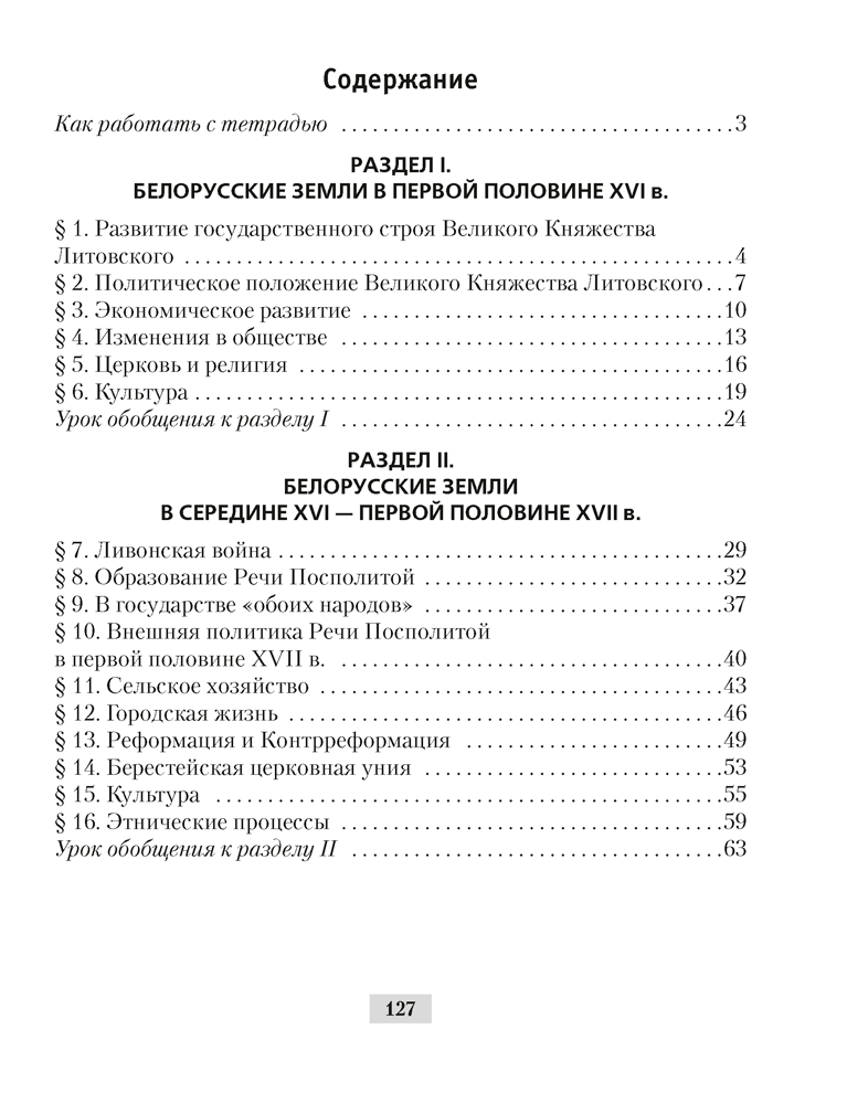 Содержание и структура рабочей тетради соответствуют программе и учебному пособию по истории Беларуси для 7 класса под редакцией В. А. Воронина и А. А. Скепьян. В тетради представлен комплекс разнообразных вопросов и заданий, которые ориентированы на систематизацию и закрепление учащимися теоретического и фактологического содержания учебного материала, а также на формирование картографических и хронологических умений. Для удобства пользования карты даны в виде картосхем. Особое внимание уделяется развитию образного мышления с опорой на учебную наглядность.