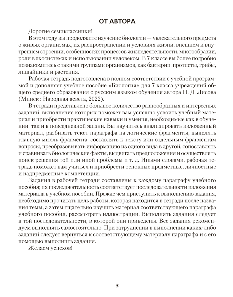 Тетрадь подготовлена в соответствии с учебной программой и учебным пособием «Биология» для 7 класса (автор Н. Д. Лисов). Ее использование в учебном процессе будет способствовать достижению каждым учеником уровня обязательной подготовки по биологии, а также поможет сформировать умение применять полученные знания на практике.