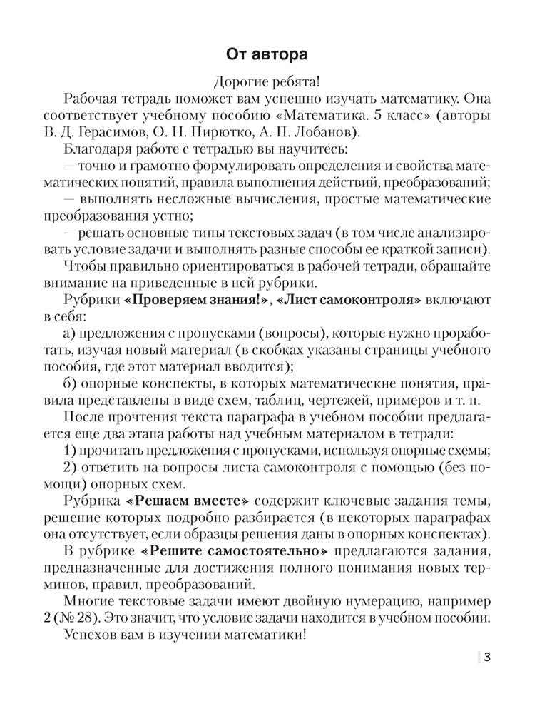 Рабочая тетрадь соответствует учебной программе и учебному пособию по математике для 5 класса (авторы В. Д. Герасимов, О. Н. Пирютко, А. П. Лобанов). В издании собраны тренировочные упражнения, которые помогут учащимся легко и быстро усвоить новый материал. Образцы выполнения заданий, частично выполненные записи вычислений, специальные задания на уяснение отдельных этапов вычислений — все это позволит разнообразить виды учебной деятельности на основе компетентностного подхода.