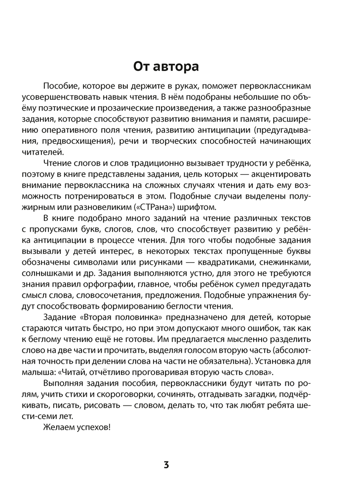 В пособии подобраны небольшие по объёму произведения, предназначенные для совершенствования навыка чтения в 1 классе. В нём размещены разнообразные задания, способствующие развитию внимания и памяти детей, расширению их оперативного поля чтения, формированию навыка предугадывания в процессе чтения, а также развитию речи и творческих способностей начинающих читателей.