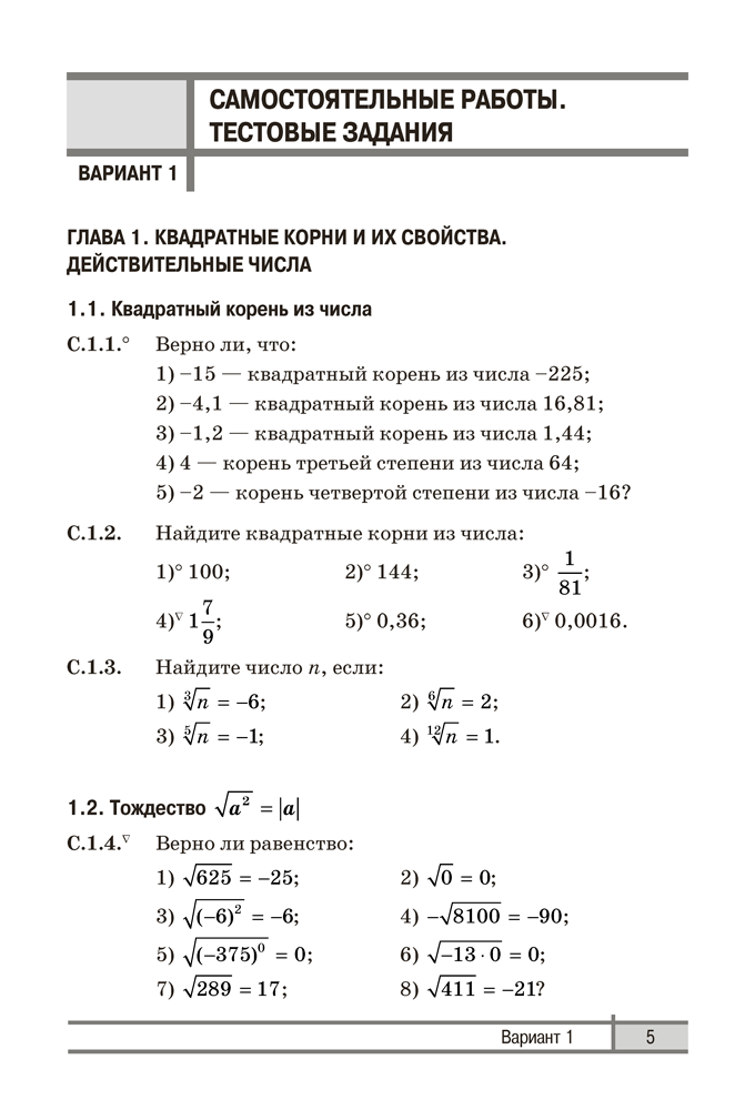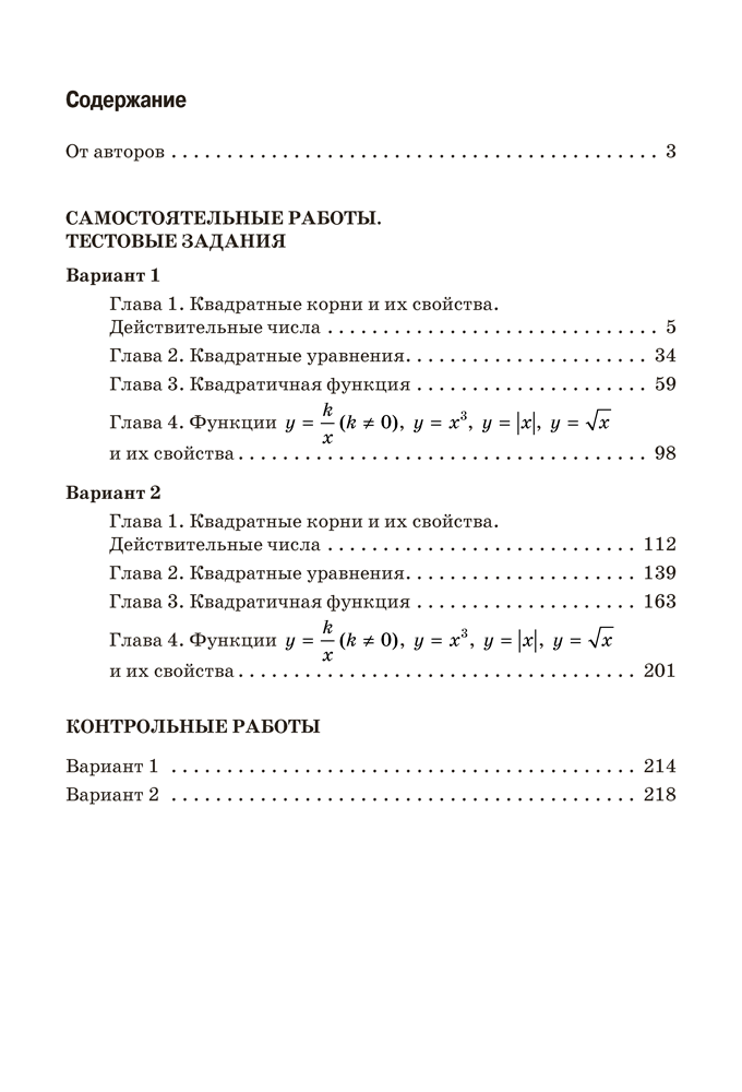 Пособие содержит обучающие самостоятельные работы, расширенные контрольные работы и итоговую контрольную работу по курсу алгебры 8 класса. Все материалы разработаны в двух равноценных вариантах.