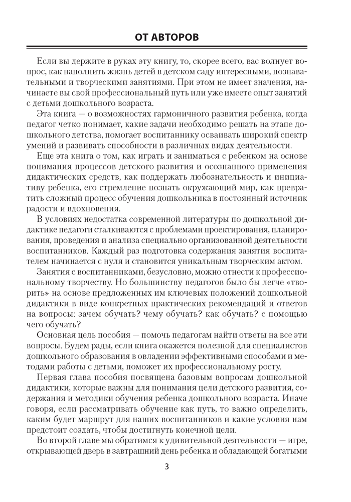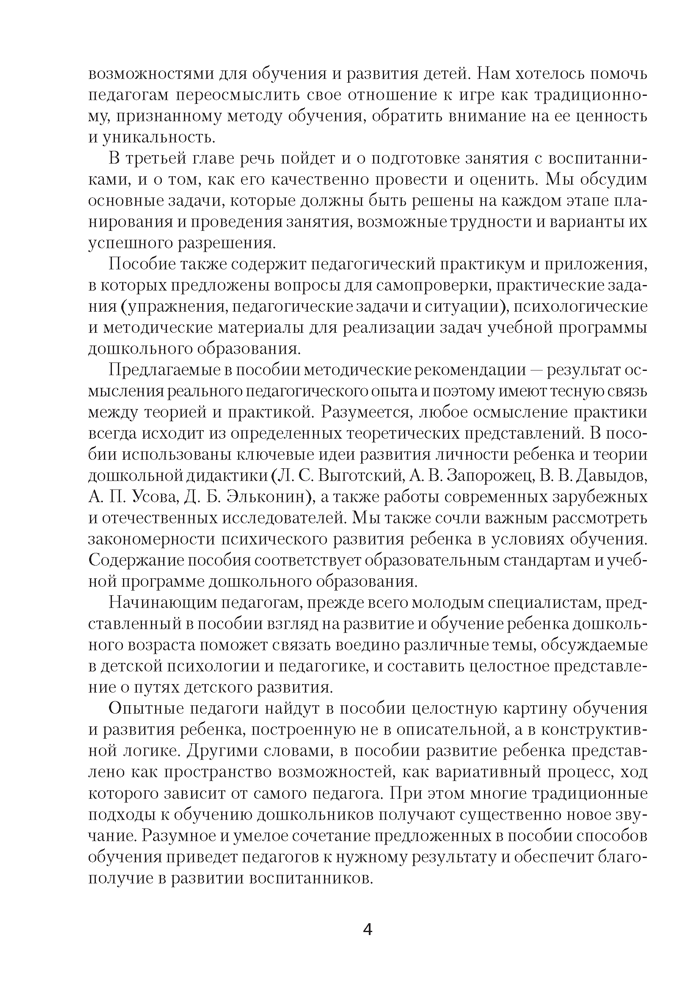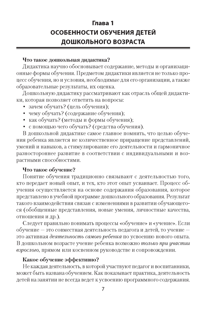 Пособие раскрывает психолого-педагогические основы обучения детей дошкольного возраста. В книге рассмотрена специфика игровой деятельности и ее связь с обучением, уделено внимание особенностям проектирования, планирования, проведения и анализа специально организованной деятельности (занятий) воспитанников в учреждении дошкольного образования. Материал пособия включает дискуссионные вопросы, примеры из педагогической практики, дидактические задания и кейсы, которые направлены на совершенствование профессиональных компетенций в области дошкольной дидактики.