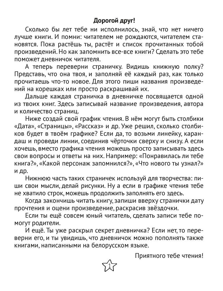 Пособие поможет учащимся систематизировать и сохранить свои впечатления от прочитанных книг, глубже понять смысл произведений, а учителям и родителям — осуществить контроль над процессом чтения. Первая половина дневника отводится для записей по произведениям на русском языке («Литературное чтение»), а вторая — для записей по произведениям на белорусском языке («Літаратурнае чытанне»).