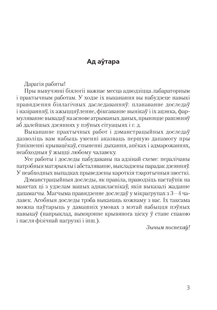 Выданне прызначана для больш эфектыўнага выканання вучнямі лабараторных і практычных работ на ўроках, а таксама падчас дэманстрацыйных доследаў. Выкарыстанне дапаможніка дазволіць не толькі сэканоміць час пры выкананні і афармленні той ці іншай работы, але і сканцэнтраваць увагу на самых важных яе этапах. Прыведзеныя заданні рознага ўзроўню складанасці дапамогуць вучням лепш зразумець і замацаваць матэрыял, а настаўніку — арганізаваць дыферэнцыраваны падыход да навучання біялогіі.
