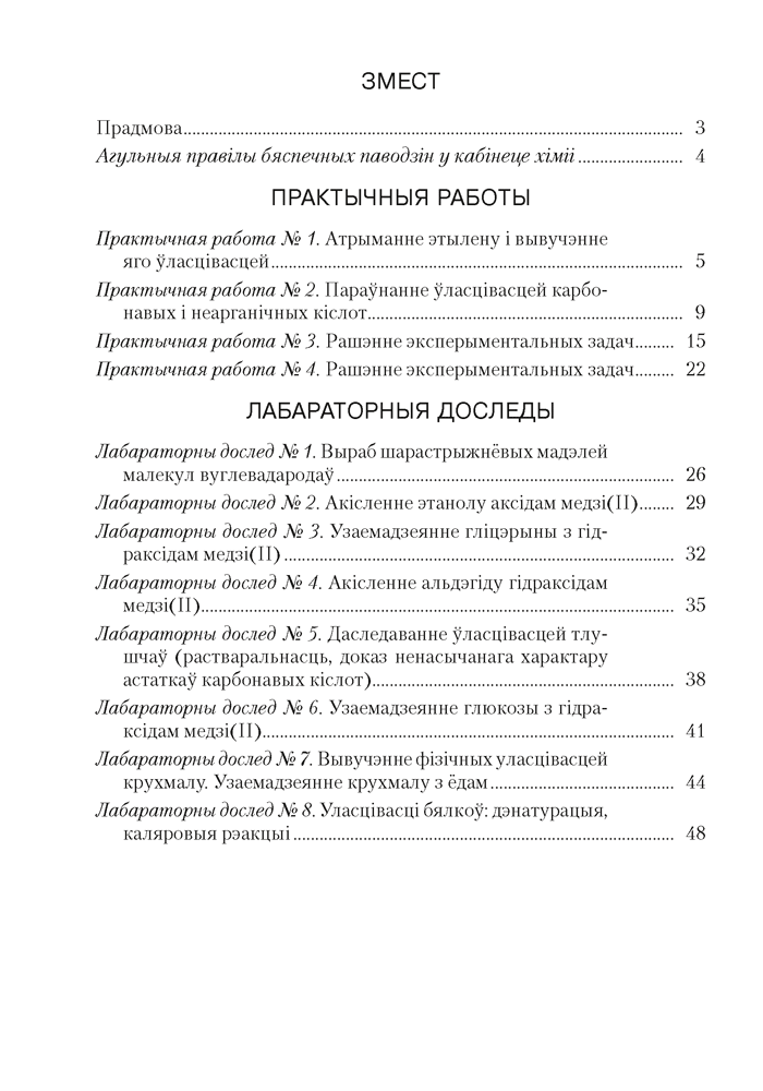 Сшытак з’яўляецца часткай вучэбна-метадычнага комплексу па хіміі для 10 класа. У ім змяшчаюцца практычныя работы і лабараторныя доследы, выкананне якіх прадугледжана вучэбнай праграмай (базавы ўзровень), прапануюцца рацыянальныя і эфектыўныя спосабы іх афармлення. Пасля кожнага лабараторнага доследу прыводзяцца рознаўзроўневыя заданні для самастойнага замацавання ведаў.