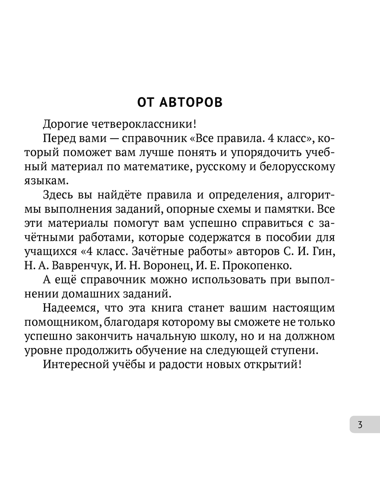 Пособие составлено в соответствии с учебной программой и содержит справочные материалы по математике, русскому и белорусскому языкам в виде наглядных таблиц и схем. Для всех правил приведены разъяснения и образцы выполнения заданий. Книга поможет учащимся быстро усвоить и запомнить изучаемый на уроке материал, а также закрепить его при работе дома. Рекомендуется использовать пособие в комплекте с тетрадью «4 класс. Зачётные работы».