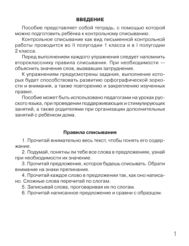 Пособие представляет собой тетрадь-тренажёр, с помощью которой можно подготовить ребёнка к контрольному списыванию. К упражнениям предусмотрены задания, выполнение которых будет способствовать развитию орфографической зоркости и внимания.