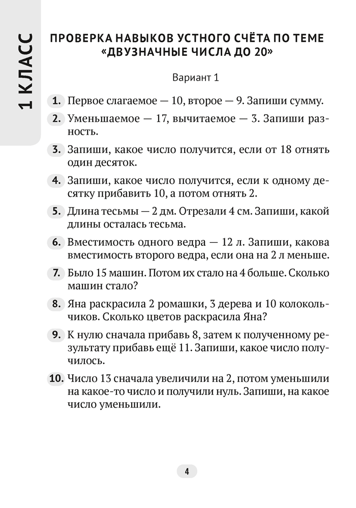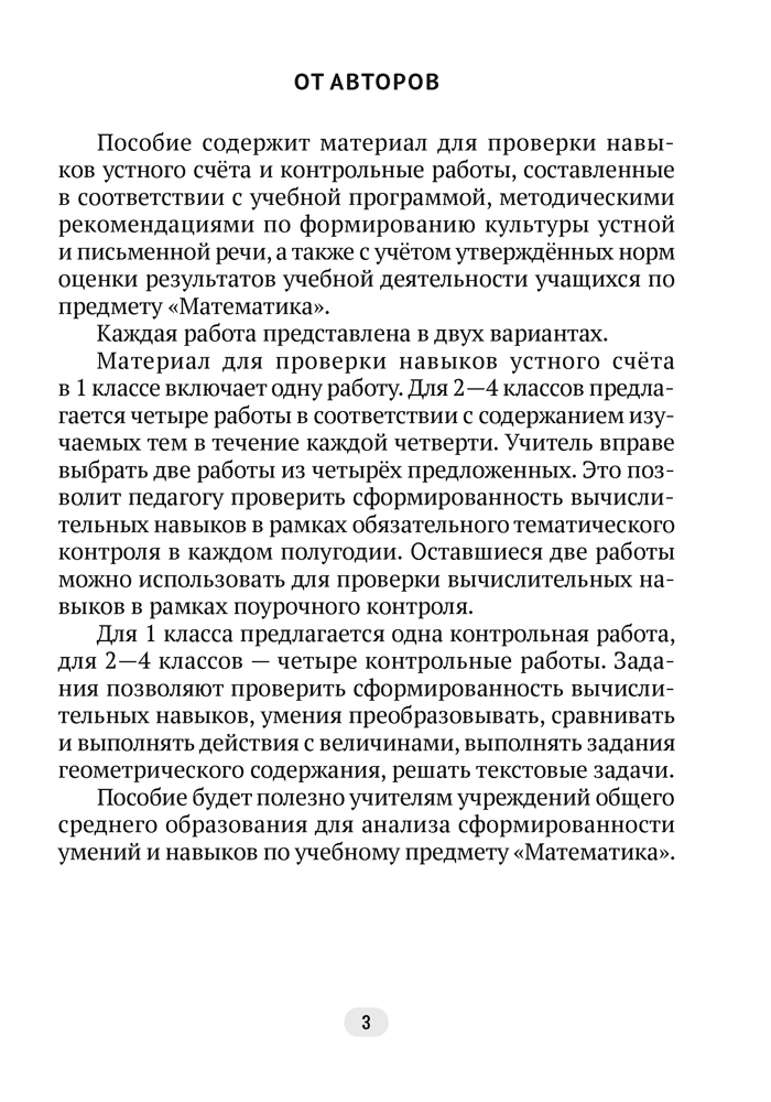 Пособие содержит материалы для проверки навыков устного счёта и контрольные работы по математике для 1—4 классов учреждений общего среднего образования с русским языком обучения.