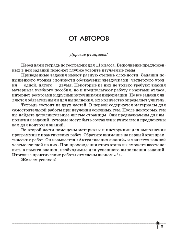 Тетрадь составлена в соответствии с программой и учебным пособием по географии для 11 класса. Она состоит из двух частей. В первой содержатся материалы для организации работы учащихся в классе и дома. Во второй части помещены материалы и инструкции для проведения программных практических работ.