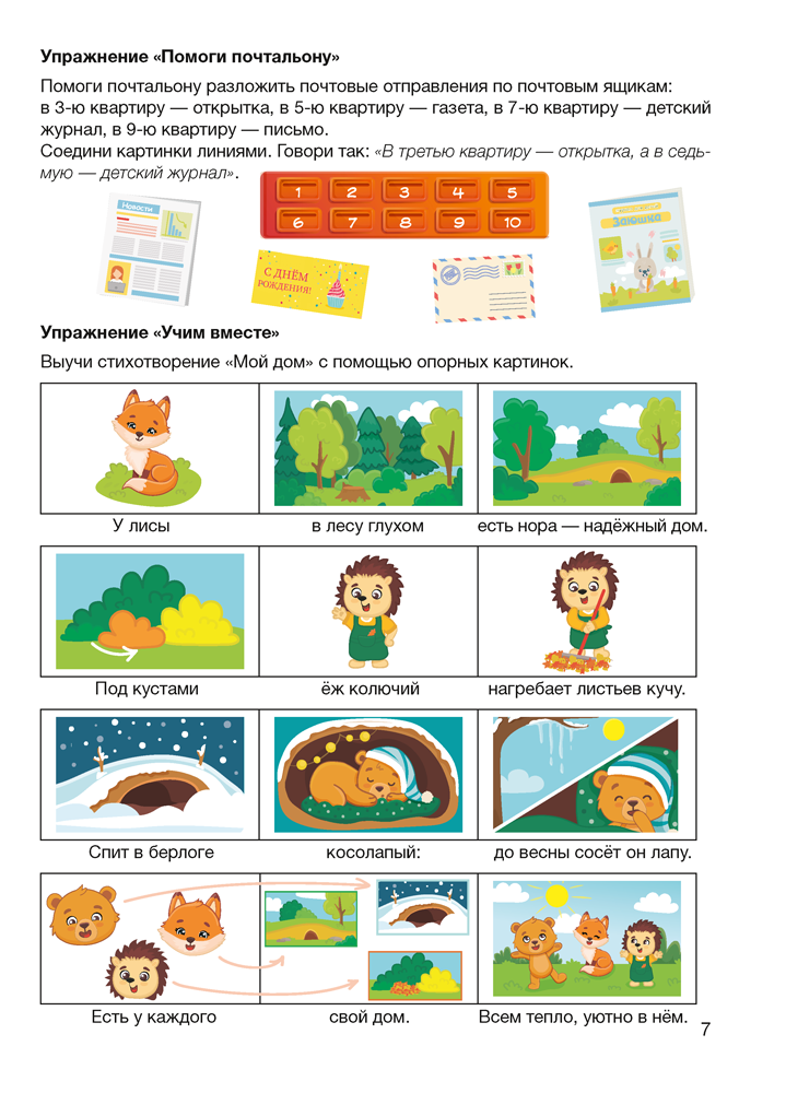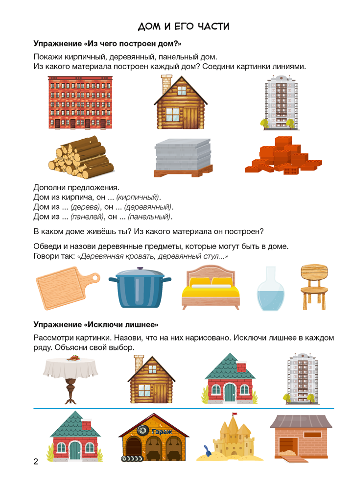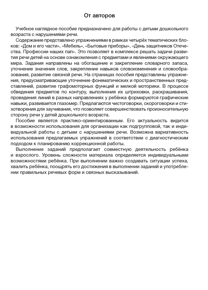 Учебное наглядное пособие предназначено для работы с детьми дошкольного возраста в пункте коррекционно-педагогической помощи. Представленный материал будет полезен учителям-дефектологам при проведении коррекционных занятий с дошкольниками, имеющими нерезко выраженное общее недоразвитие речи (неосложнённый вариант, осложнённый вариант (при дизартрии и ринолалии)). Содержание пособия включает упражнения, объединённые в 4 тематических блока: «Дом и его части», «Мебель», «Бытовые приборы», «День защитников Отечества. Профессии наших пап». Это позволяет в комплексе решать поставленные учебные задачи, развивать речь детей на основе ознакомления с предметами и явлениями окружающего мира.