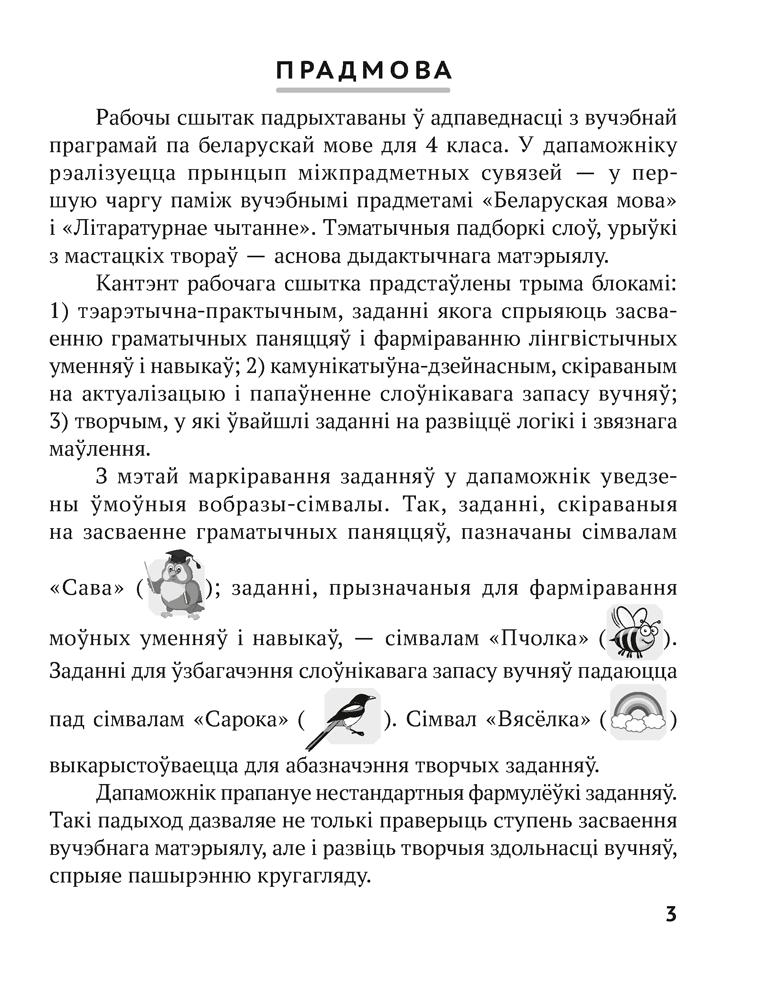 Сшытак адпавядае вучэбнай праграме і зместу падручнікаў па беларускай мове і літаратурным чытанні. У дапаможніку прапануюцца цікавыя творчыя заданні розных узроўняў складанасці, што дазволіць школьнікам праверыць і замацаваць атрыманыя на ўроках веды. Рэалізаваны ў выданні прынцып міжпрадметных сувязей будзе садзейнічаць комплекснаму засваенню вучэбнага матэрыялу.