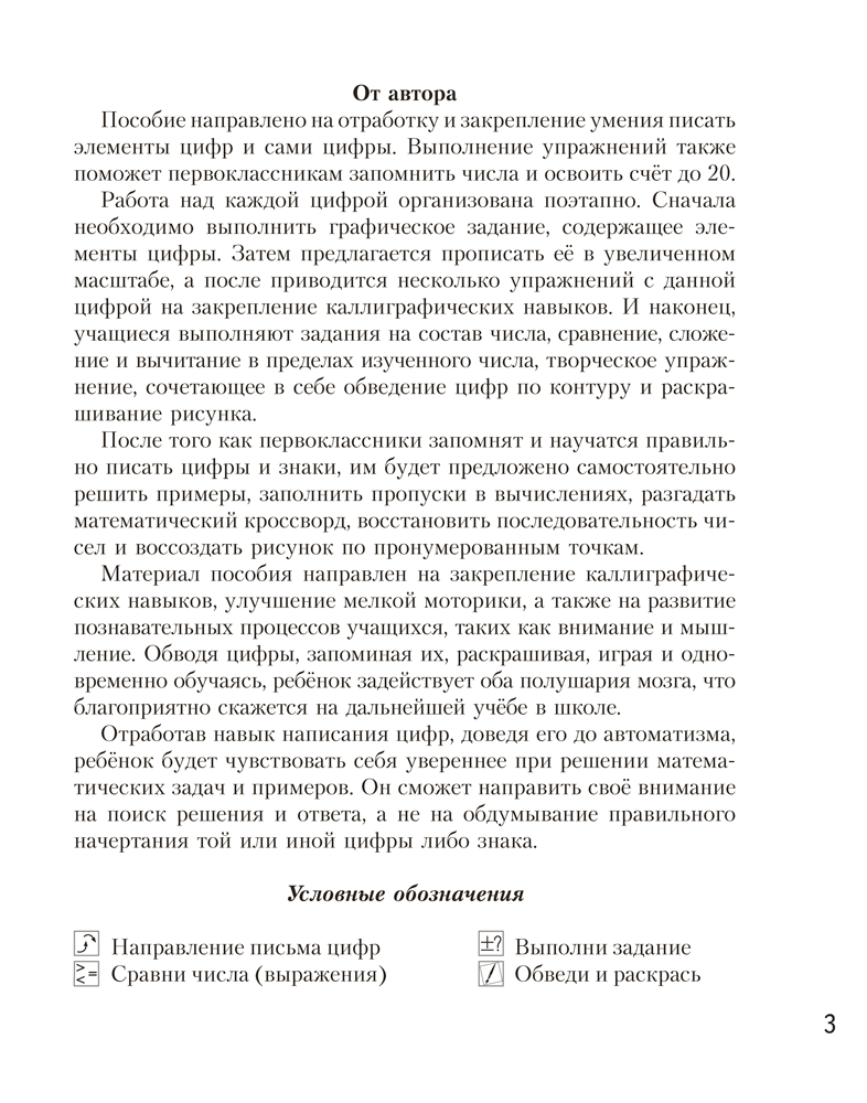 Пособие предназначено для закрепления каллиграфических навыков и улучшения мелкой моторики, а также для развития познавательных процессов учащихся, таких как внимание и мышление. Обводя цифры, запоминая их, раскрашивая, играя и одновременно обучаясь, ребёнок задействует оба полушария мозга, что благоприятно скажется на дальнейшей учёбе в школе.