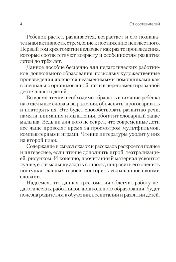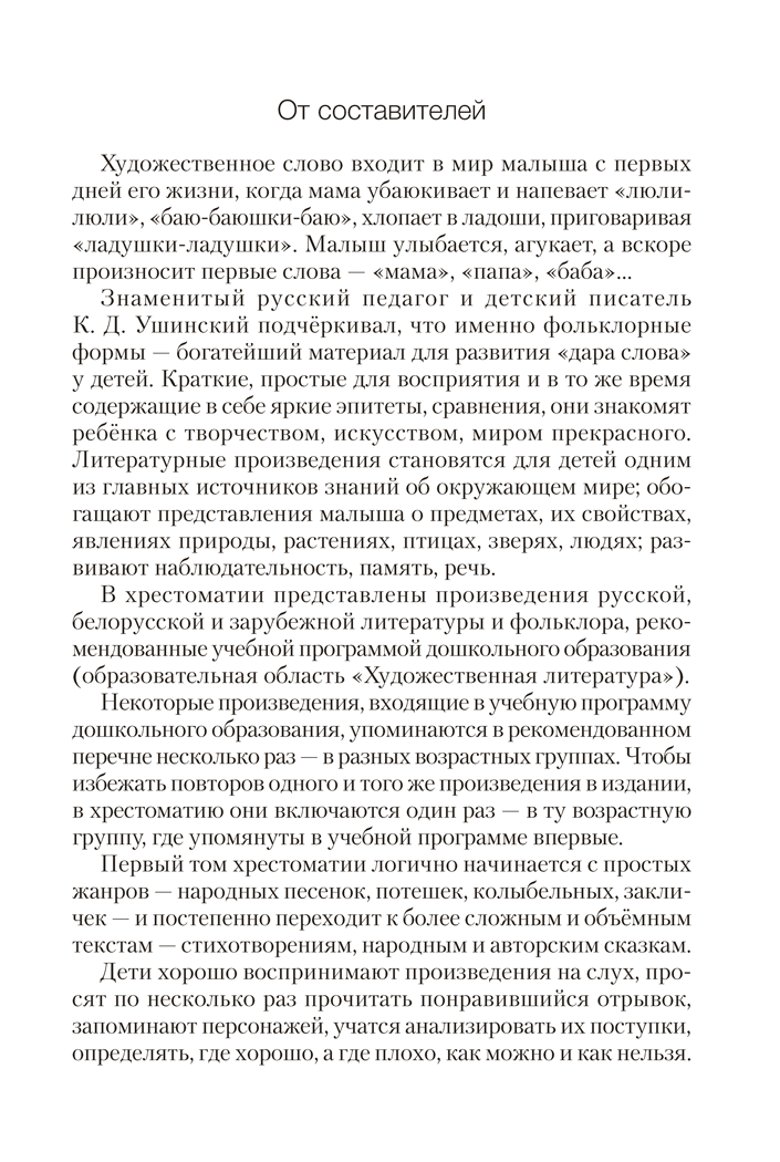 Хрестоматия включает произведения художественной литературы, рекомендованные учебной программой дошкольного образования.