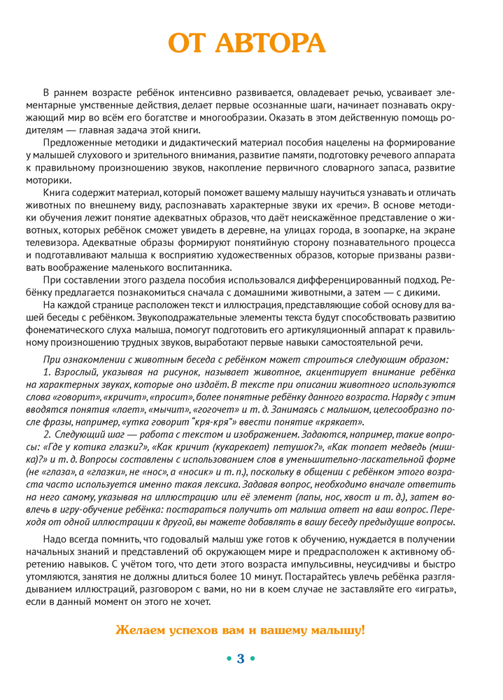 Предложенная методика и дидактический материал пособия нацелены на формирование у детей раннего возраста слухового и зрительного внимания, развитие памяти, подготовку речевого аппарата к правильному произношению звуков, накопление первичного словарного запаса. Издание содержит материал, который поможет ребенку научиться отличать животных по внешнему виду, распознавать характерные звуки их «речи».