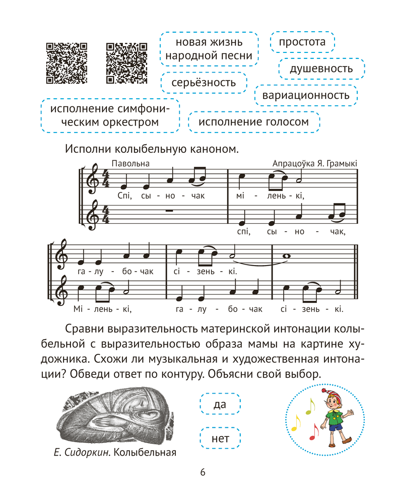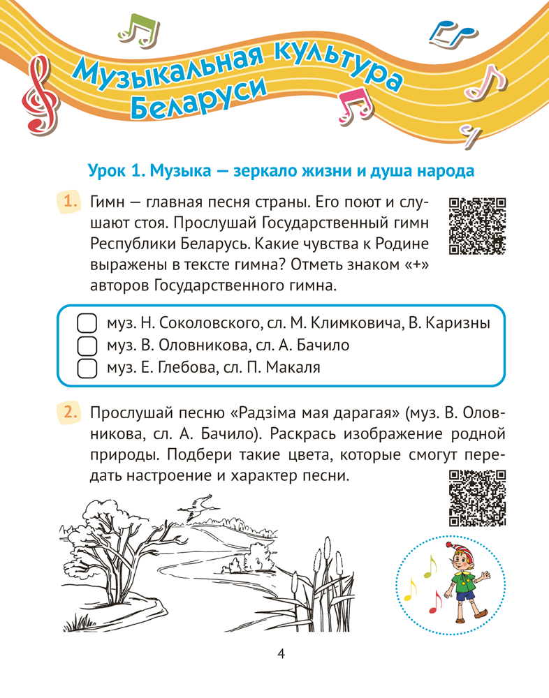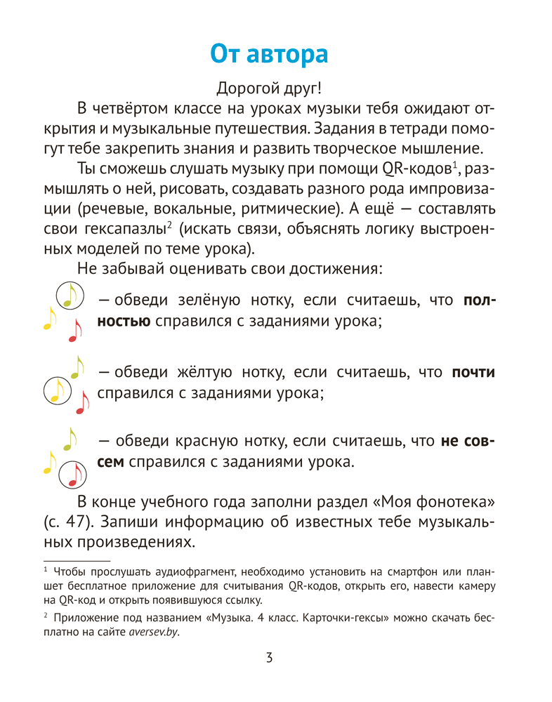 Рабочая тетрадь соответствует учебной программе по музыке и содержит разнообразные задания, направленные на развитие творческих способностей учащихся и формирование интереса к предмету. В пособии размещены QR-коды, с помощью которых четвероклассники смогут послушать фрагменты музыкальных произведений. На каждом уроке предусмотрена система самооценки. При закреплении знаний предлагается использовать гексы, доступные для бесплатного скачивания на сайте, а также пособие «Музыка. 4 класс. Демонстрационные плакаты».