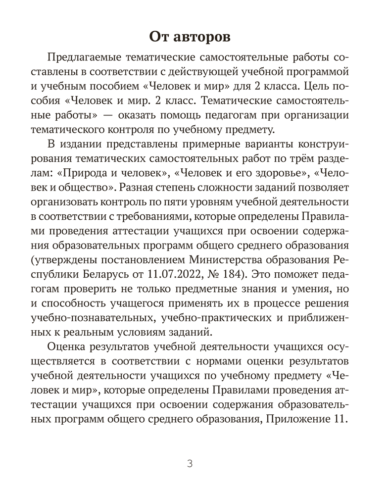 Тематические самостоятельные работы составлены в соответствии с учебной программой и учебным пособием «Человек и мир» для 2 класса, а также методическими указаниями по организации контроля и оценки результатов учебной деятельности учащихся. Пособие поможет педагогам организовать тематический контроль по пяти уровням учебной деятельности учащихся, проверить не только предметные знания и умения учащихся, но и умение работать с информацией.