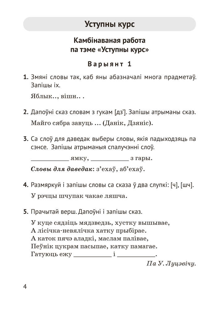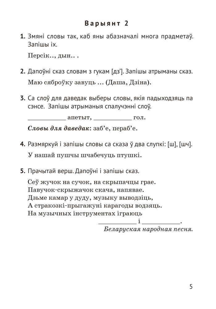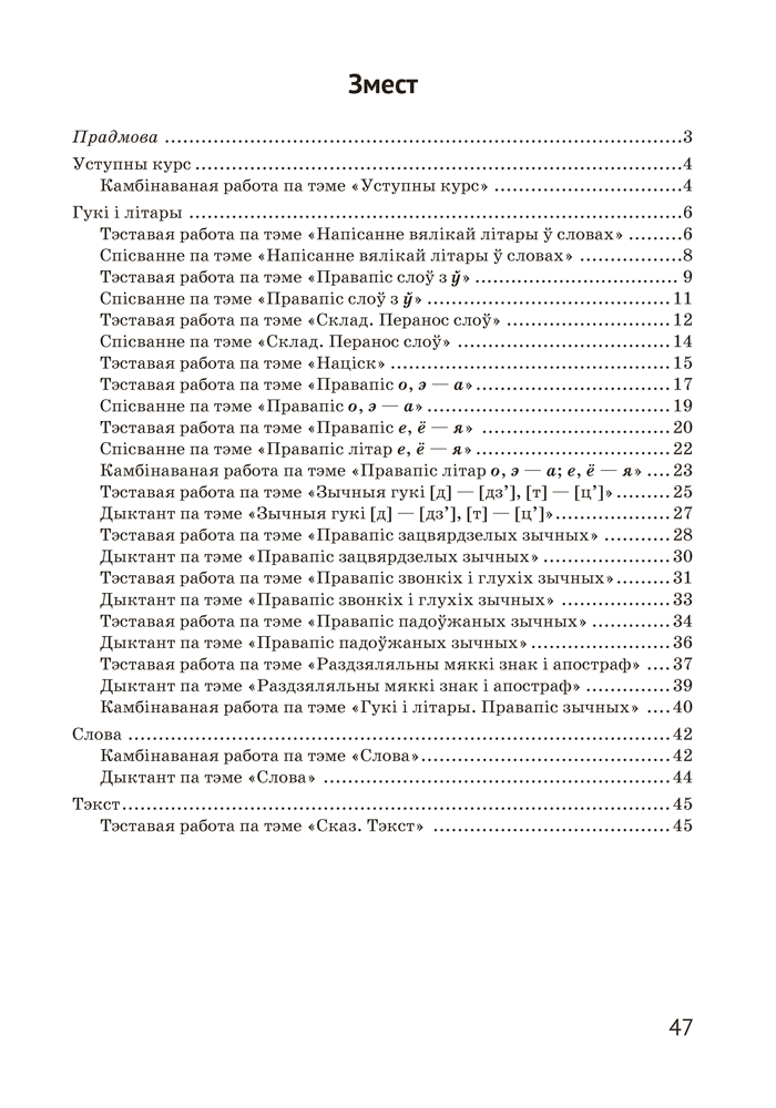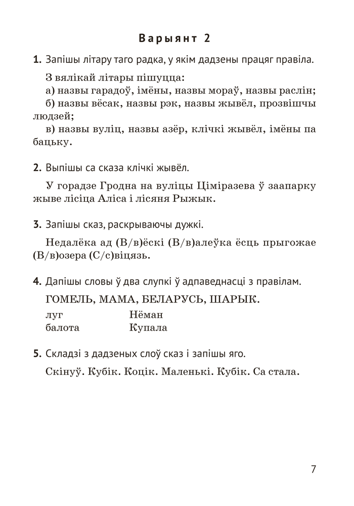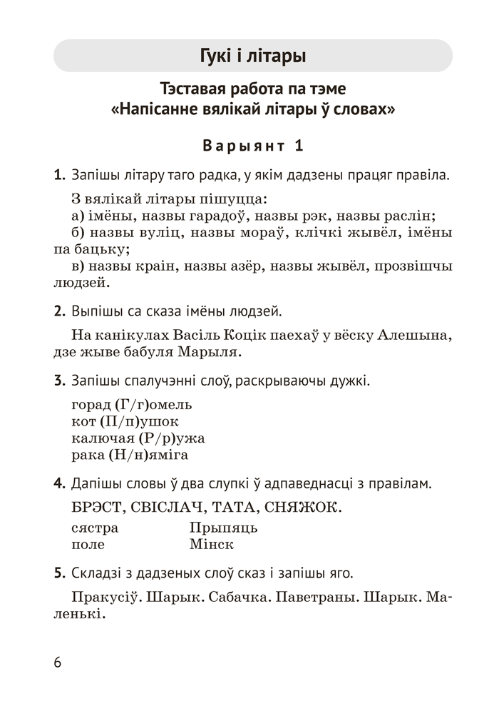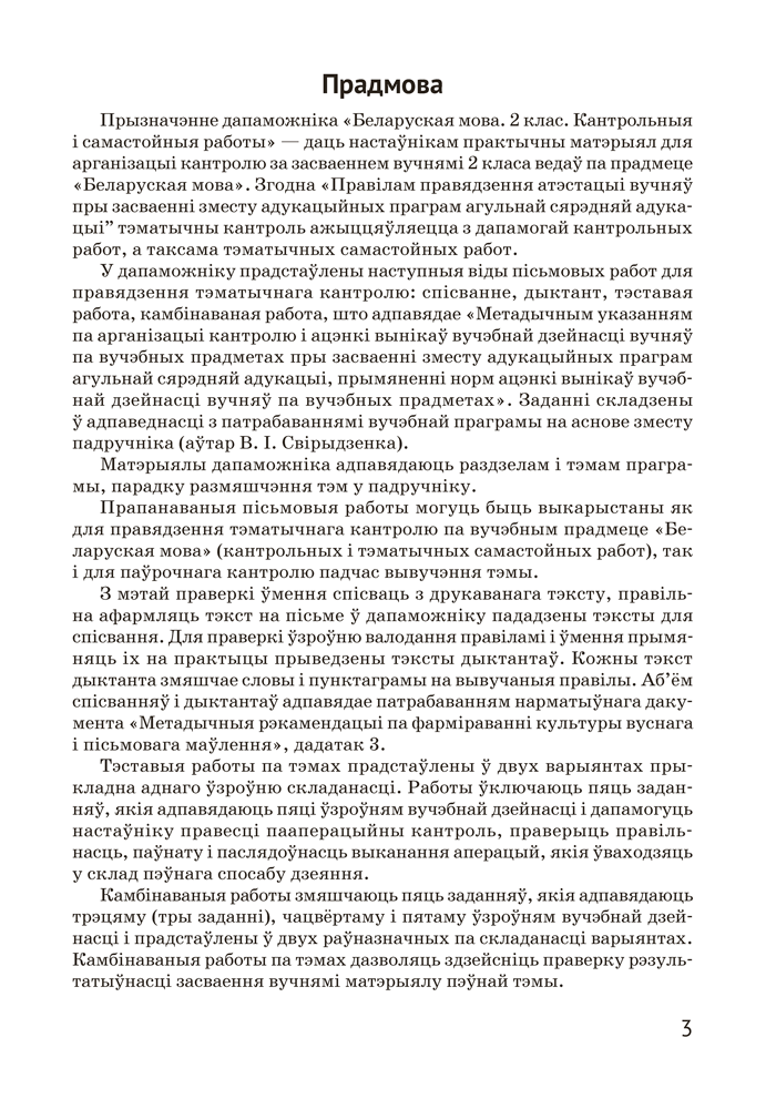 Дапаможнік змяшчае матэрыялы для арганізацыі кантрольна-ацэначнай дзейнасці вучняў 2 класа: тэставыя і камбінаваныя работы, спісванні і дыктанты. Прапанаваныя заданні могуць быць выкарыстаны для правядзення кантрольных работ або падчас вывучэння тэмы.