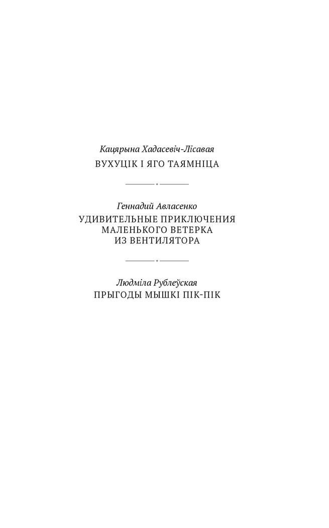 Новая кніга з серыі «Сучасная беларуская літаратура» ўключае творы Кацярыны Хадасевіч-Лісавой, Генадзя Аўласенкі і Людмілы Рублеўскай. Пісьменнікі добра ведаюць дзіцячую псіхалогію, умеюць размаўляць з чытачом на мове дзяцінства і робяць гэта без лішняй дыдактыкі і гучных павучанняў.