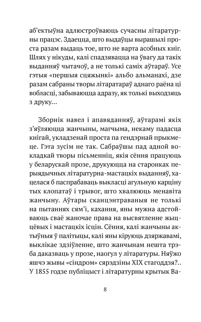 Новая кніга з серыі «Сучасная беларуская літаратура» прысвечана жаночай прозе. Пісьменніцы ў сваіх творах надаюць увагу паўсядзённаму, усім нам зразумеламу жыццю. Падрабязна апісваючы рэчаіснасць, аўтары прымушаюць чытача шмат пра што задумацца.