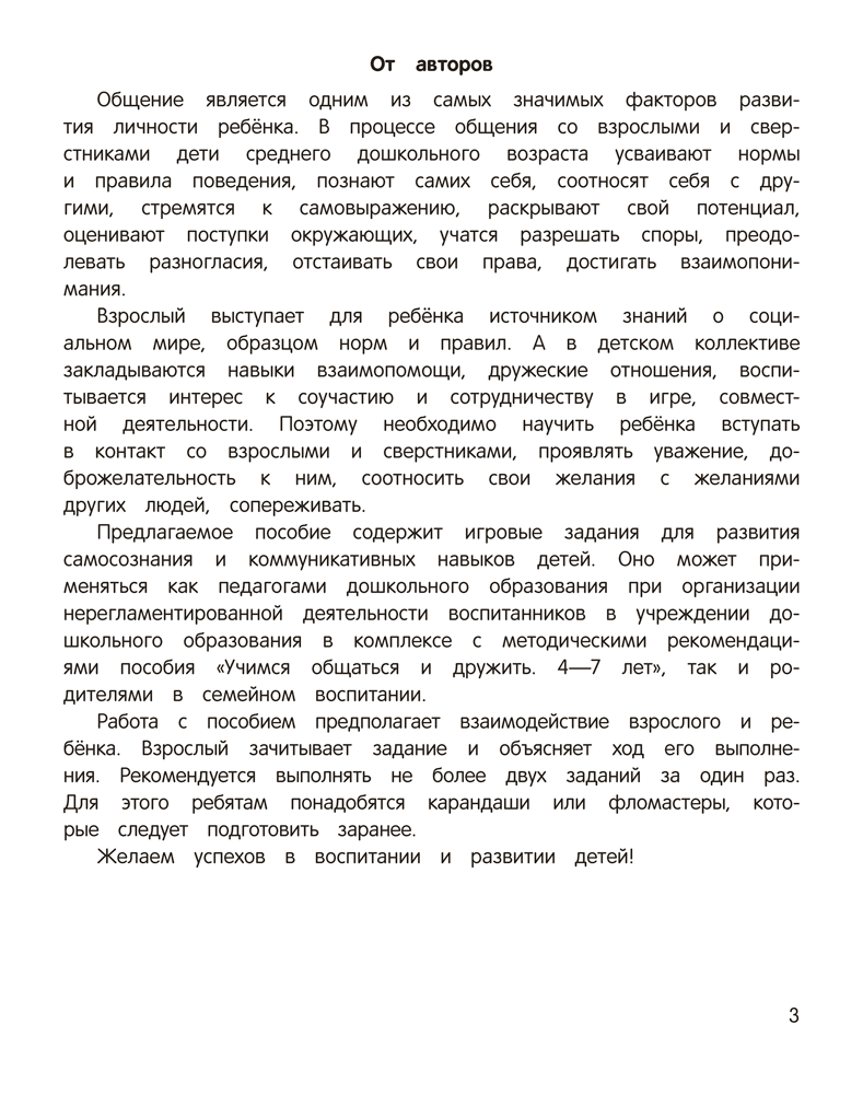 Пособие содержит игровые задания для развития самосознания и коммуникативных навыков детей 4–5 лет. Представленный материал будет полезен педагогам дошкольного образования при организации нерегламентированной деятельности воспитанников в учреждении дошкольного образования в комплексе с методическими рекомендациями, а также родителям в семейном воспитании.