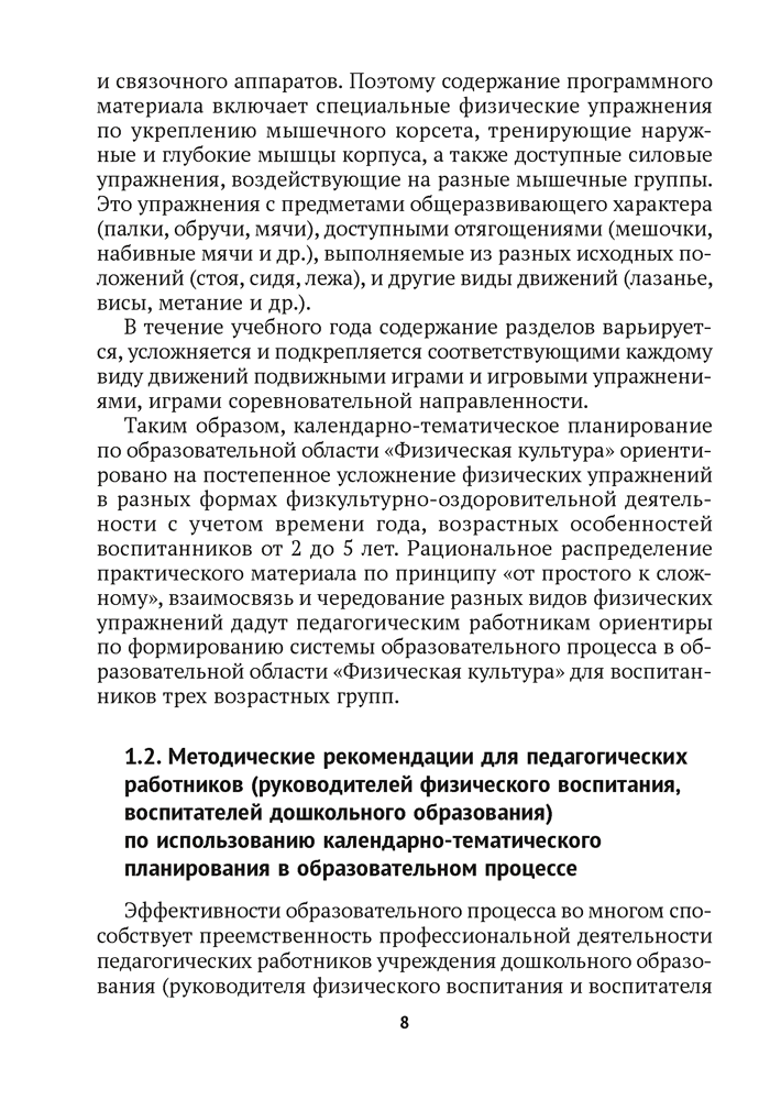 Авторское примерное календарно-тематическое планирование разработано в соответствии с учебной программой дошкольного образования (образовательная область «Физическая культура») для воспитанников трех возрастных групп: первой младшей (от 2 до 3 лет), второй младшей (от 3 до 4 лет), средней (от 4 до 5 лет).