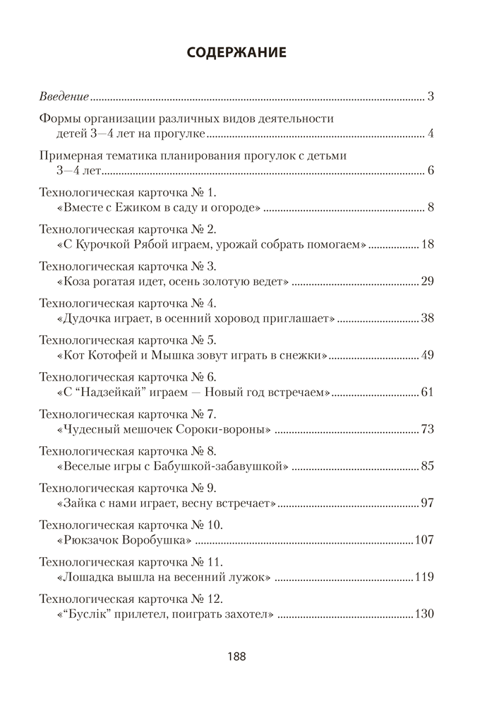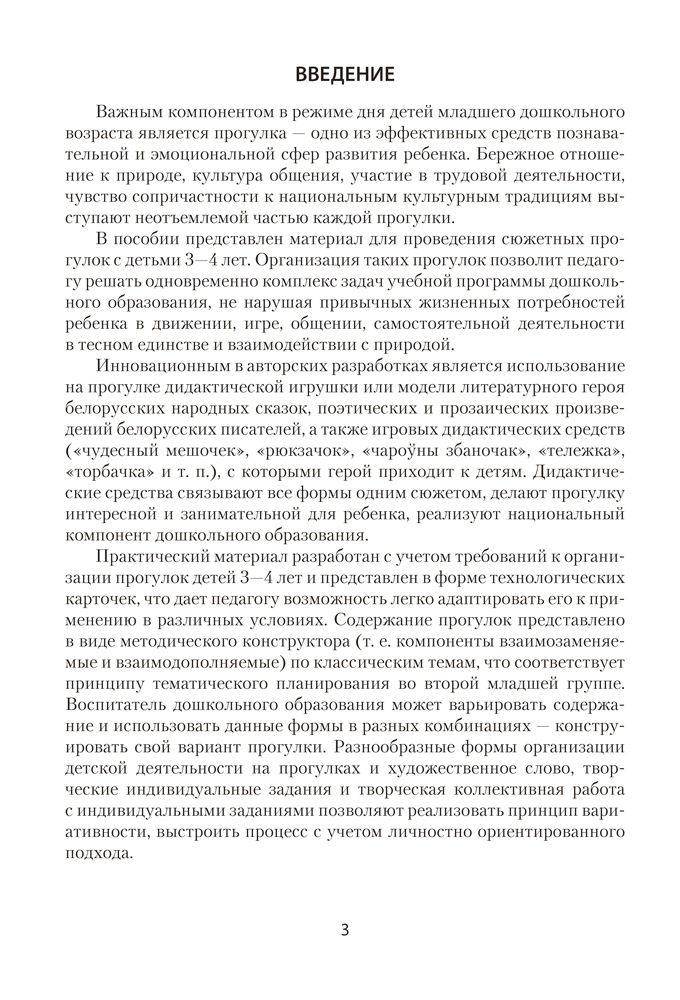 В пособии представлен материал для проведения сюжетных прогулок с детьми от 3 до 4 лет: содержание педагогической работы, формы организации, методы и приемы реализации задач. Технологические карточки разработаны с учетом достижений современной дошкольной педагогики и тематического планирования образовательного процесса, направлены на разностороннее развитие ребенка, комплексное решение задач обучения и воспитания, реализацию национального компонента дошкольного образования.
