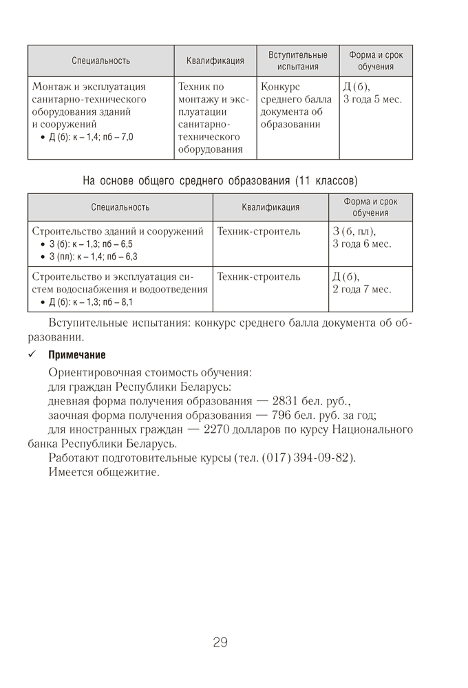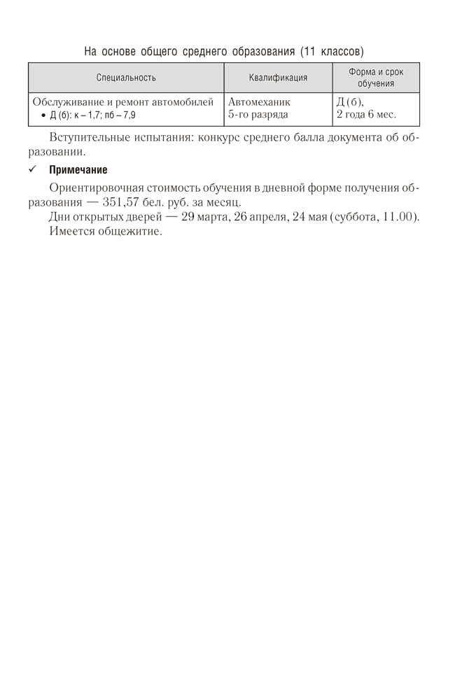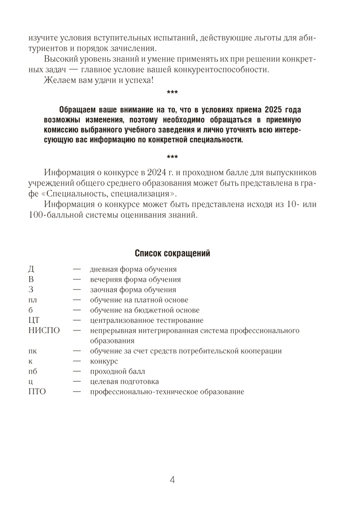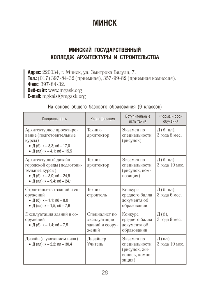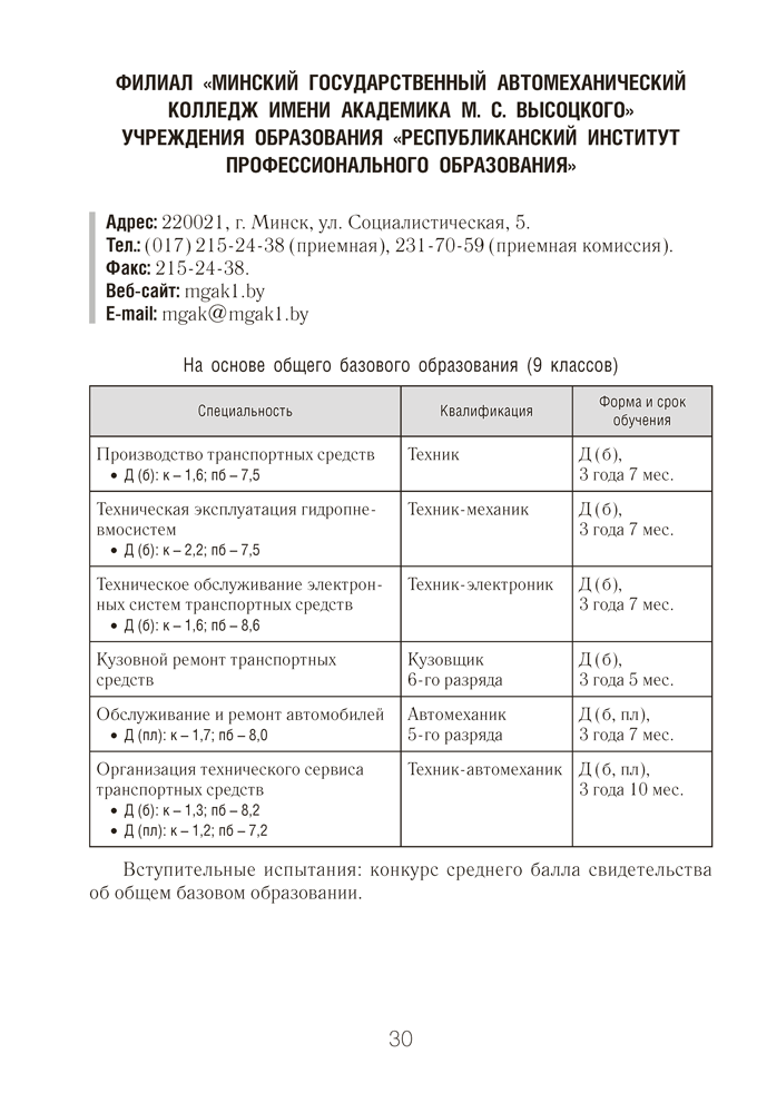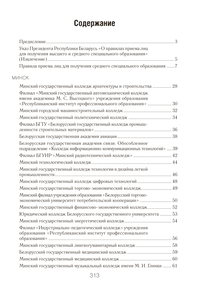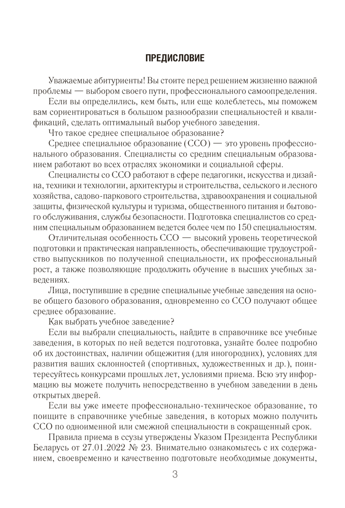 В справочнике содержатся Правила приема лиц для получения среднего специального образования в Республике Беларусь и информация об учреждениях среднего специального образования (адрес, веб-сайт, специальности, квалификации, формы получения образования, вступительные испытания, конкурс и проходной балл в 2024 году).