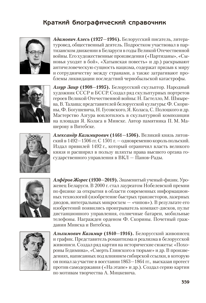 В книге представлен теоретический материал и практические задания, соответствующие содержанию учебных программ по предмету «История Беларуси» для 6—9 и 10—11 классов. Схемы, иллюстрации, таблицы, картосхемы содействуют лучшему усвоению учебного материала. В конце пособия приведены ответы к тестовым заданиям, терминологический, хронологический и биографический справочники.