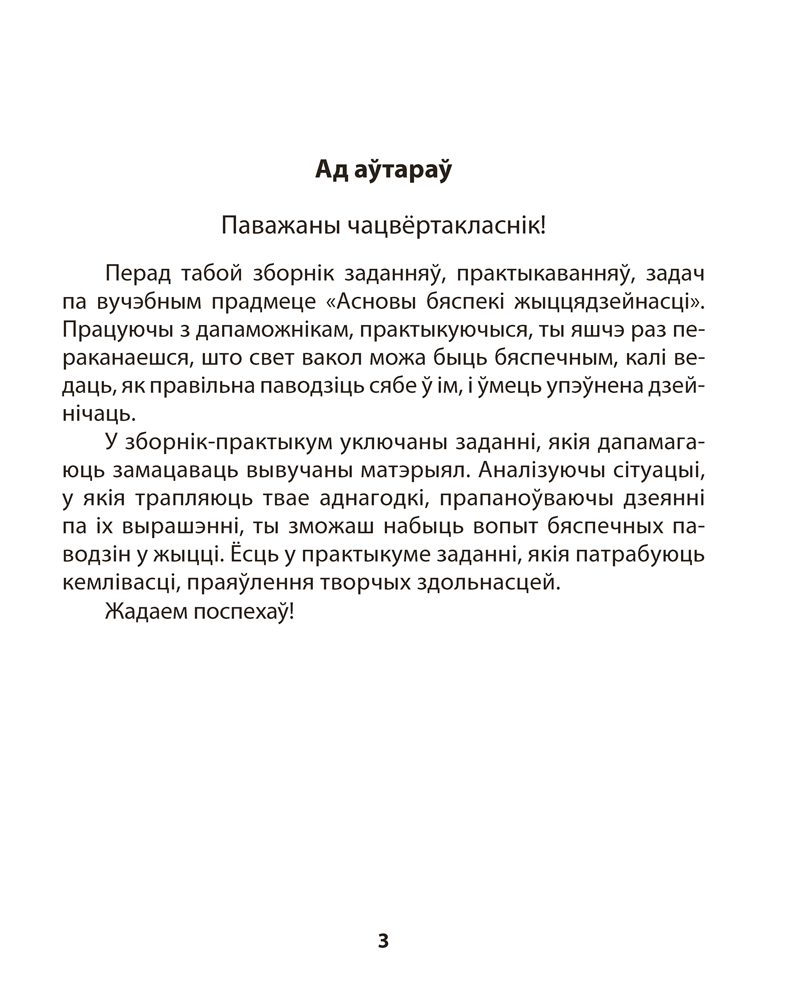 Матэрыял практыкуму адпавядае патрабаванням вучэбнай праграмы па прадмеце «Асновы бяспекі жыццядзейнасці». Заданні распрацаваны з улікам узроставых асаблівасцей вучняў і суправаджаюцца ілюстрацыйным матэрыялам. Работа з дапаможнікам дазволіць сфарміраваць мадэлі бяспечных паводзін ва ўмовах штодзённага жыцця і ў розных небяспечных сітуацыях.