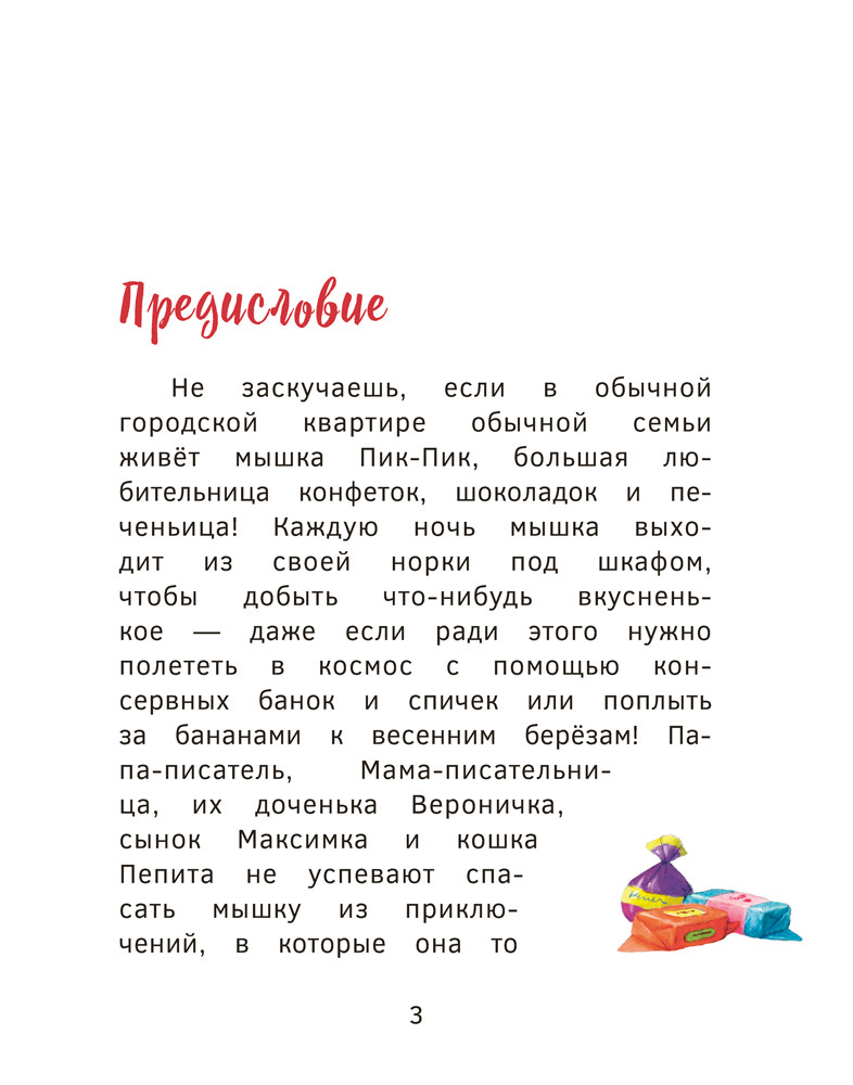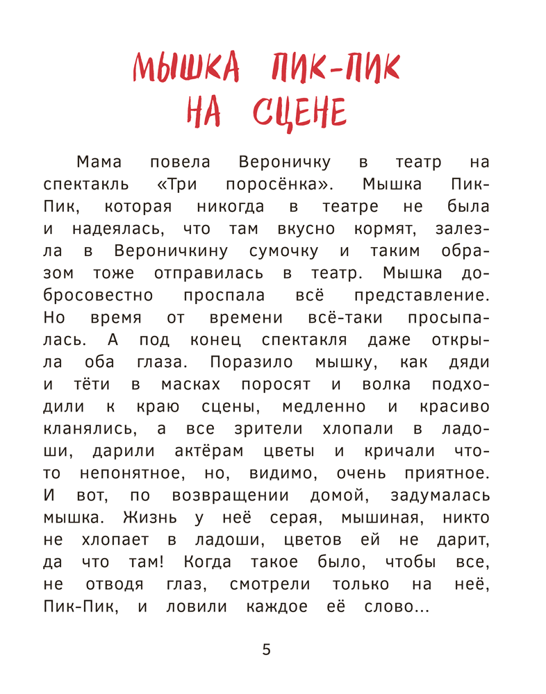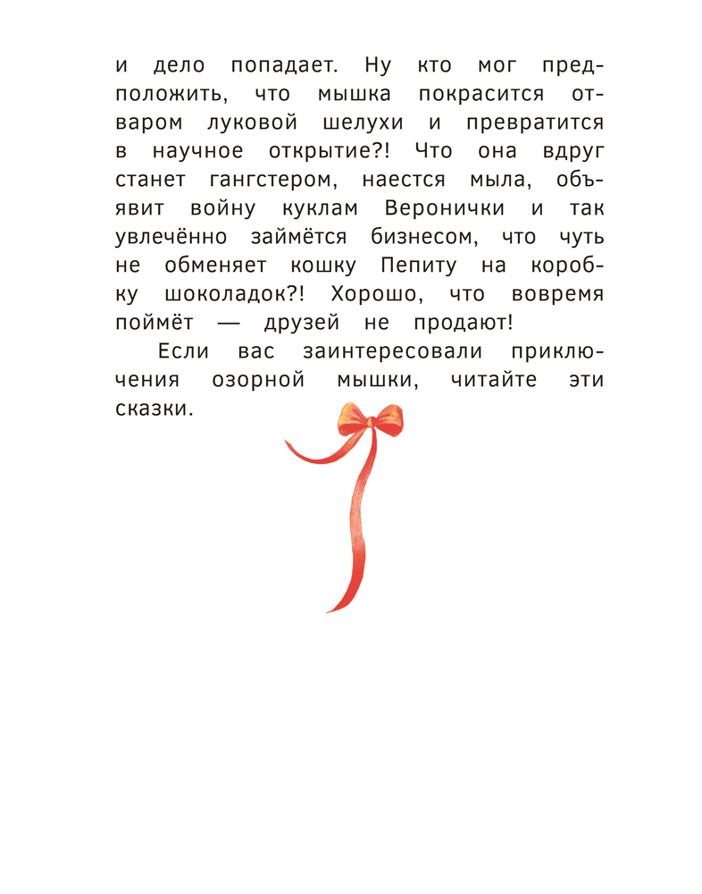 В книге читатели вместе с толстенькой, ленивой, но обаятельной мышкой отправятся в деревню за вкусностями, в путешествие за бананами и даже в космический полёт, а также сыграют в занимательную игру.