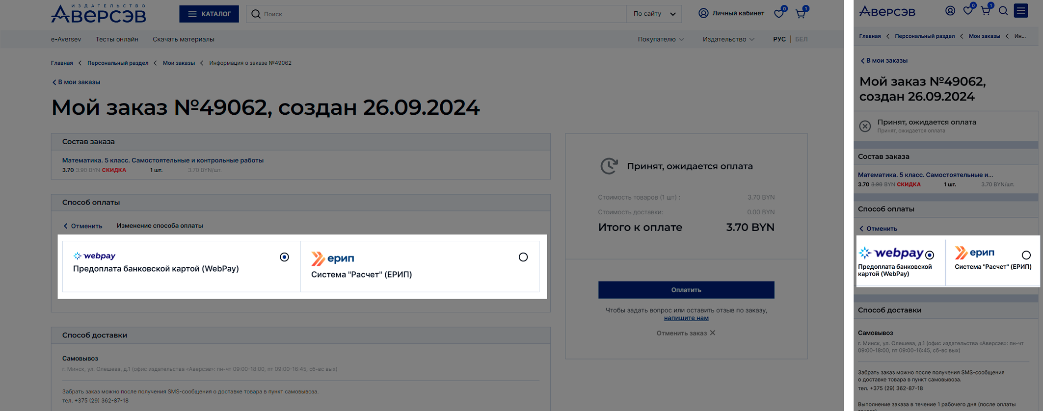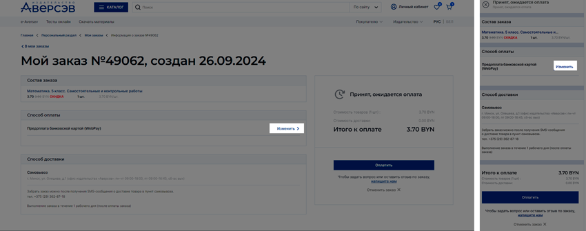 2. Выберите нужный заказ и в строке «Способ оплаты» нажмите Изменить.