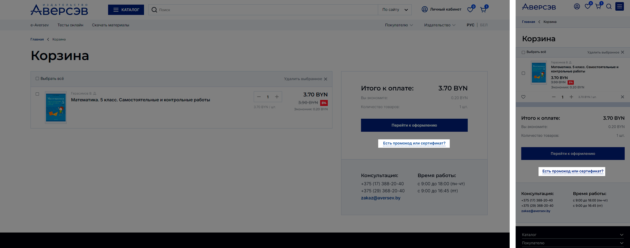 2. В Корзине в окне с общей суммой заказа нажмите Есть промокод или сертификат. В появившемся поле введите промокод.
